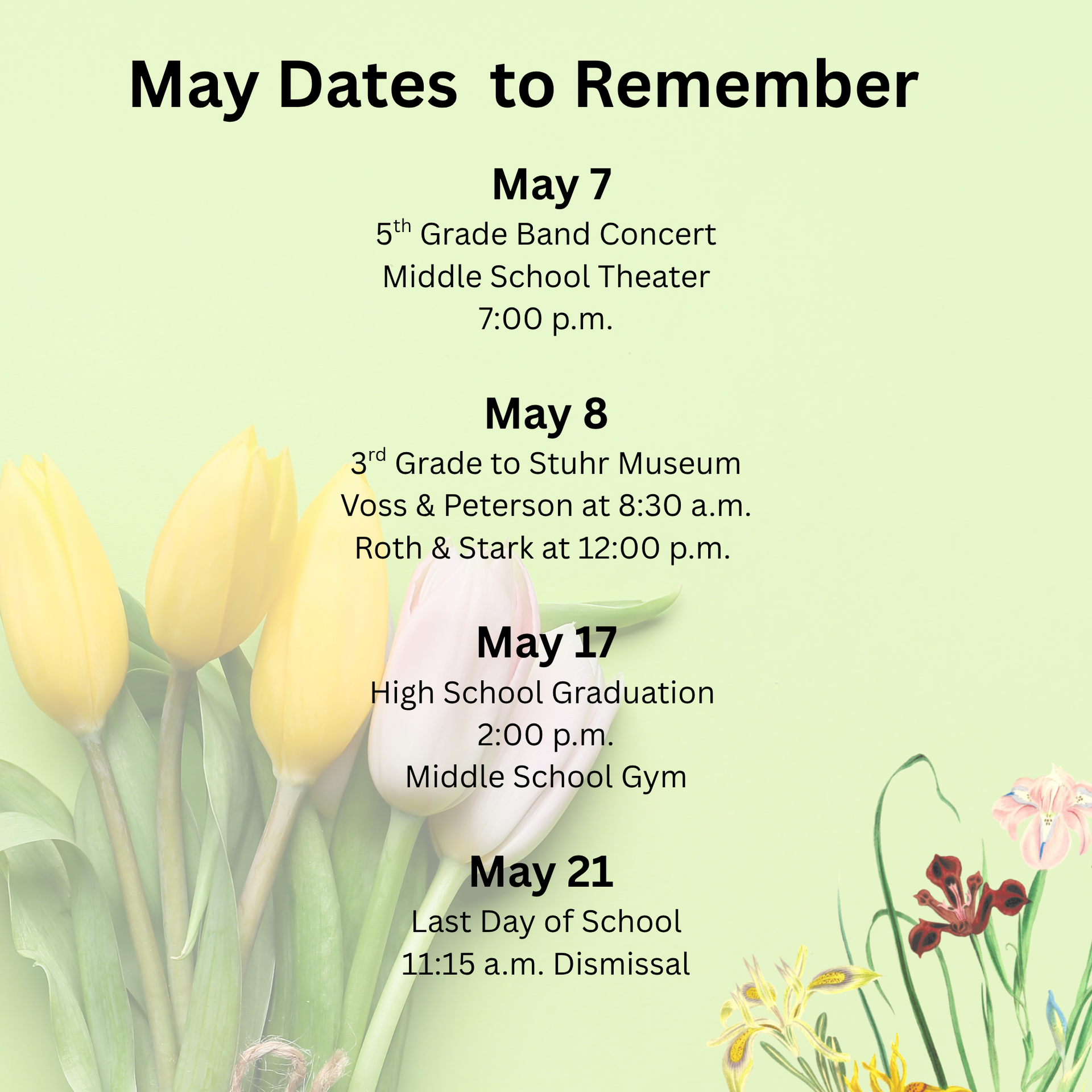 This is the final newsletter for this school year. The end of the year seems to always bring about some changes, and this year is no exception. Mrs. Meyer and Mrs. Wilson will be retiring at the end of the school year. These two individuals have served the children of the district for several years! We will also be saying goodbye to Mrs. Roth and Mrs. Otto as they have both resigned from their positions. Best wishes to each of these staff members as they begin a new chapter of life!